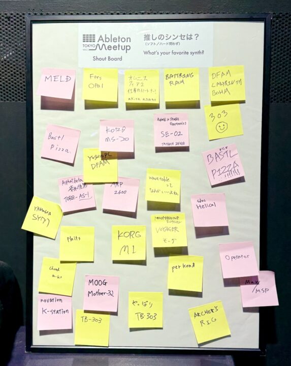 今回のShout Boardでは、皆さんに「推しのシンセは?」を挙げてもらいました。最多得票は定番のRoland TB-303でしたが、2位がBastl Instruments Pizza (FMシンセシスとウェーブシェイピングオシレーターのモジュール)というマニアックさ。これも今回のミートアップを象徴するようなマニアックさではないでしょうか…笑